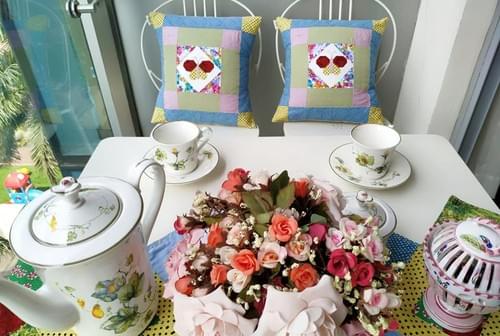 Không chỉ vậy, những chiếc gối tựa cùng chú bướm xinh xắn và tấm khăn trải bàn patchwork đầy sắc màu khiến bàn trà thêm phần ấm áp và lãng mạn. Cắm thêm một lọ hoa hồng, thế là mình có ngay không gian thư giãn chuẩn “homestay” ngay tại nhà.