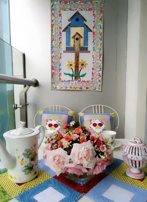 Chiếc thảm treo tường hình ngôi nhà chim với họa tiết hoa hướng dương tươi sáng đã biến bức tường đơn điệu thành một bức tranh sống động. Ngồi nhâm nhi trà, ngắm thảm quilting bay bay trong gió, tự nhiên thấy lòng dịu lại sau một ngày dài.