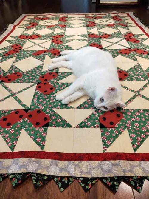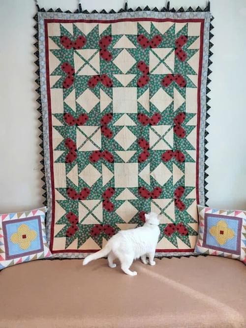 Hình ảnh bạn đang thấy là một bức quilt (chăn ghép vải) đầy màu sắc, được phối hợp từ họa tiết hoa lá xanh mát và những chú bọ rùa đỏ xinh xắn – biểu tượng của may mắn và niềm vui. Không chỉ mang tính thẩm mỹ, quilt còn là nghệ thuật ghép nối từng mảnh nhỏ để tạo nên một bức tranh lớn, giống như cách chúng ta ghép từng kỷ niệm vào cuộc sống.