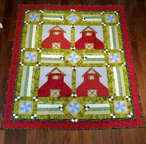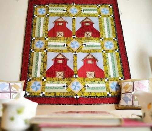 Bức quilt với họa tiết những ngôi nhà đỏ nổi bật, được bao quanh bởi sắc vàng, xanh, và những ô sao xanh dương, mang lại cảm giác như ta đang ngồi trong một làng quê yên bình. Sự kết hợp hài hòa giữa màu sắc và hình khối tạo nên một bức tranh sống động, nhưng vẫn chan chứa sự ấm áp.