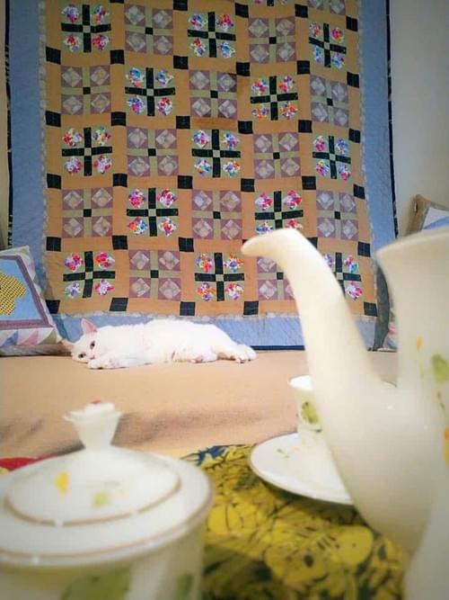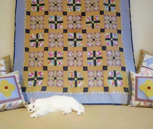Bức quilt được phối từ những ô vuông hài hòa, với sắc hoa rực rỡ nổi bật trên nền màu trung tính. Mỗi họa tiết như một bông hoa nhỏ đang bung nở, tạo cảm giác ấm áp và căng tràn nhựa sống. Khi kết hợp cùng không gian thưởng trà và ánh sáng dịu nhẹ, quilt trở thành điểm nhấn tinh tế, vừa gần gũi vừa sang trọng.
