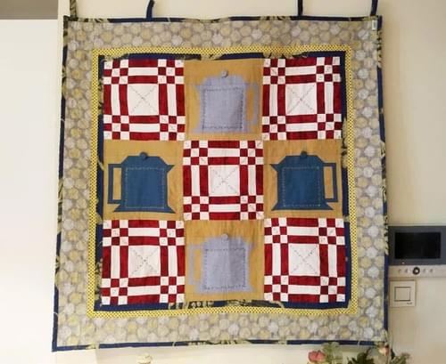 Một buổi chiều tĩnh lặng, một góc bàn với ấm trà, vài bông hoa cắm lọ, và trên tường là bức quilt nổi bật với hình ảnh những chiếc bình trà cách điệu – tất cả hòa quyện thành một bức tranh ấm cúng và đầy chất thơ.