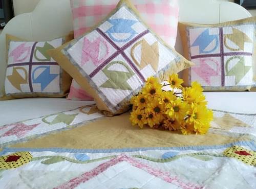 Bạn có cảm nhận được hương xuân tràn ngập trong từng đường kim, mũi chỉ của bộ chăn gối này không? 💛