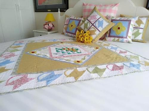 Với họa tiết bông hoa vàng tươi nổi bật trên nền vải pastel nhẹ nhàng, sản phẩm quilt mang đến cảm giác ấm áp, tươi mới và đầy sức sống cho không gian nghỉ ngơi.